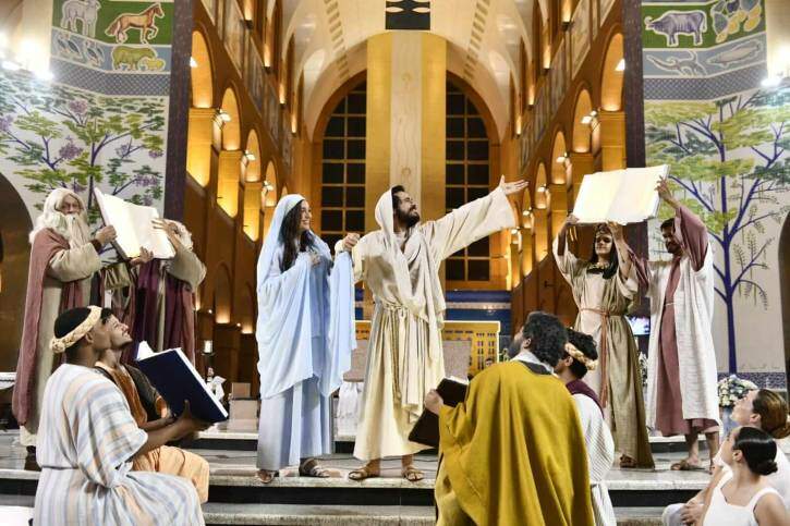 Por meio de uma representação musical dos personagens principais das fachadas já entregues, Maria, Noé, José do Egito, Moisés, os discípulos e Jesus, recordaram a trajetória da Jornada Bíblica até este momento e prepararam o coração dos devotos para a homenagem.