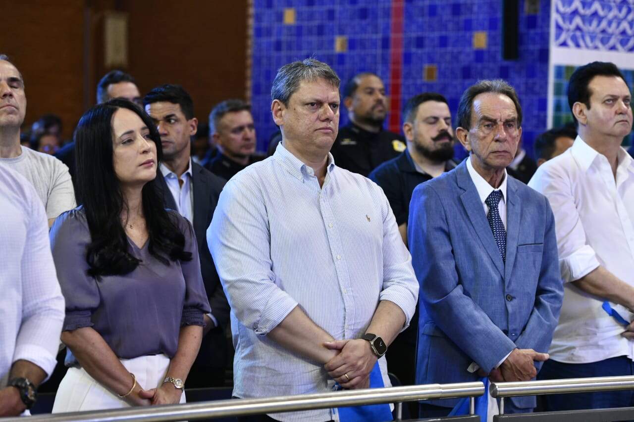 O governador do Estado de São Paulo, Tarcísio de Freitas, participou da celebração em uma área reservada juntamente com outras autoridades políticas locais.