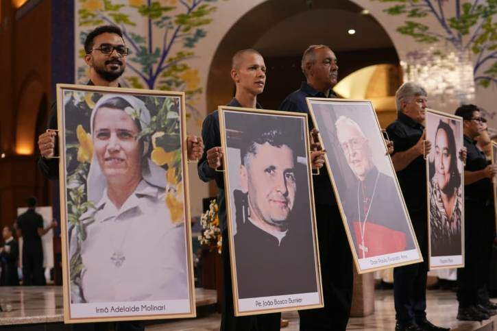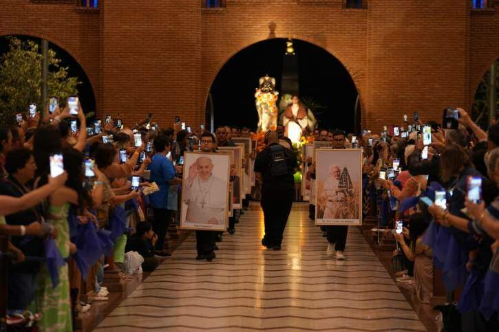 Seminaristas e jovens levaram fotos de algumas personalidades escolhidas para representar a mensagem do dia, que destacou as bem-aventuranças. Esse momento marcante precedeu a notória entrada da imagem de Nossa Senhora Aparecida, que estava ornada no carro andor com lindas flores laranjas.
