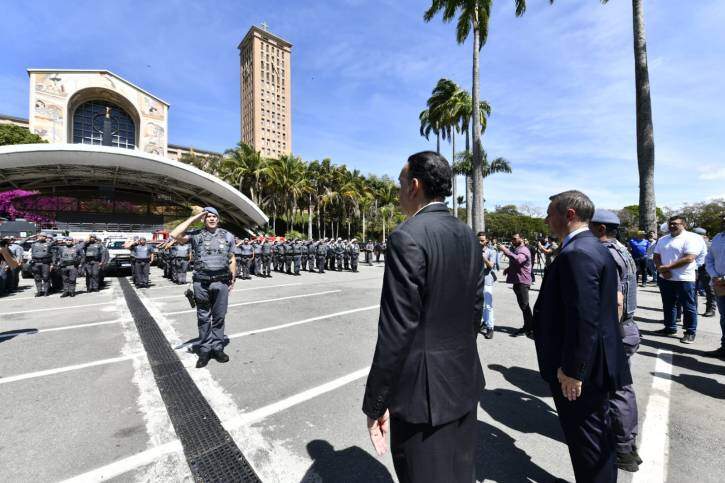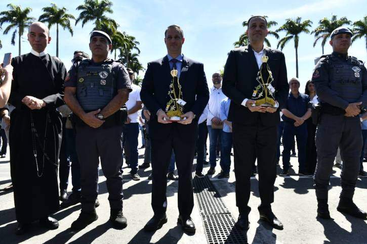 “A operação romeiro que inclui o nosso Santuário Nacional de Aparecida, o Santuário Frei Galvão de Guaratinguetá, Canção Nova em Cachoeira Paulista, como dito aqui, a Rota da Luz 195 km de Mogi até aqui que será acompanhada pelas nossas forças de segurança pra garantir aos fiéis um trajeto tranquilo. Também no Caminho da Fé 300 km de rota desde Águas da Prata até aqui. Como dito pelo nosso secretário de segurança, 2285 policiais, 555 viaturas, 96 motos, uma aeronave, 10 cavalos e 17 bases móveis que estarão ao longo de todo o percurso também, com a agilidade das bases móveis, podendo serem deslocadas, conforme a necessidade”.