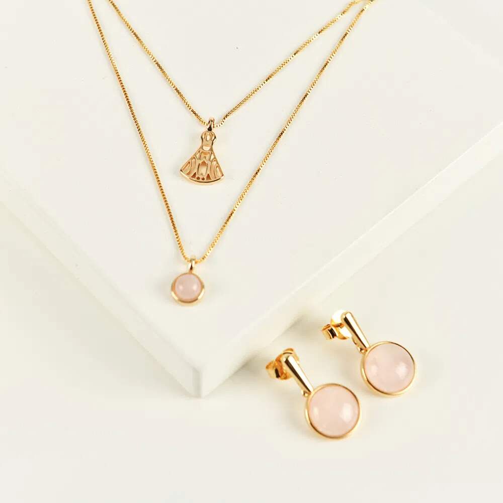 Composto por um colar duplo que leva uma pedra natural rosa e um pingente de Nossa Senhora Aparecida, além de um par de brincos com pedra natural.