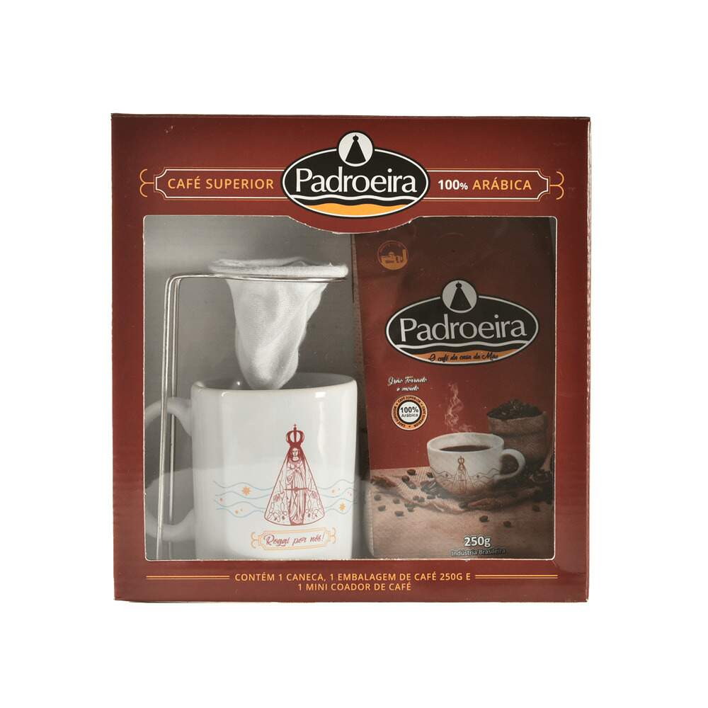 O Kit é composto por uma caneca em modelo AZ em cerâmica, acompanha o tradicional Café Padroeira 250g e um lindo mini coador.