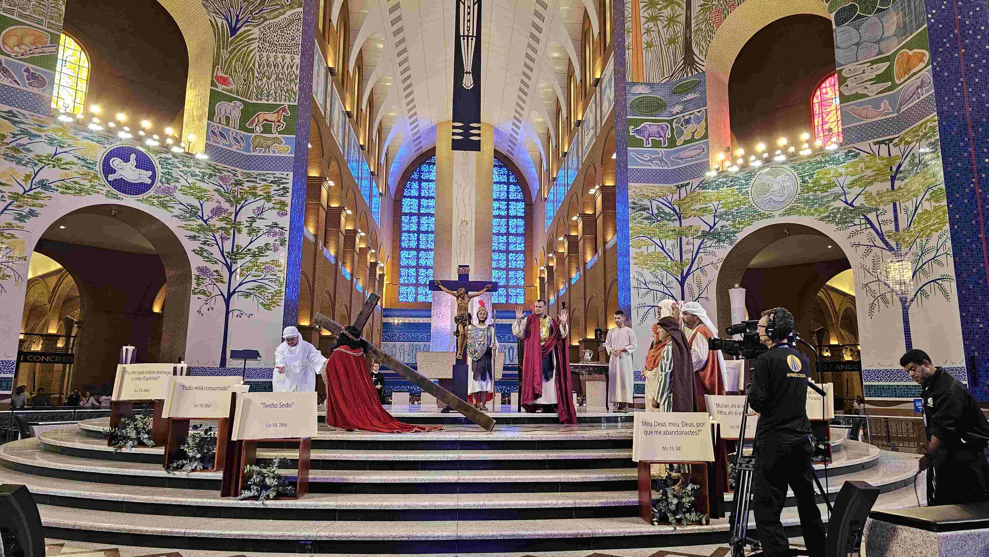 O Santuário Nacional celebrou hoje (29), às 12h, o Sermão das Sete Palavras de Jesus na Cruz. O momento foi presidido no Altar Central pelos Missionários Redentoristas e prefeito de Igreja do Santuário Nacional, Padre Ferdinando Mancílio e Ir. André Luiz, diretor da Academia Marial e contou com encenações da Paixão e Morte de Jesus.