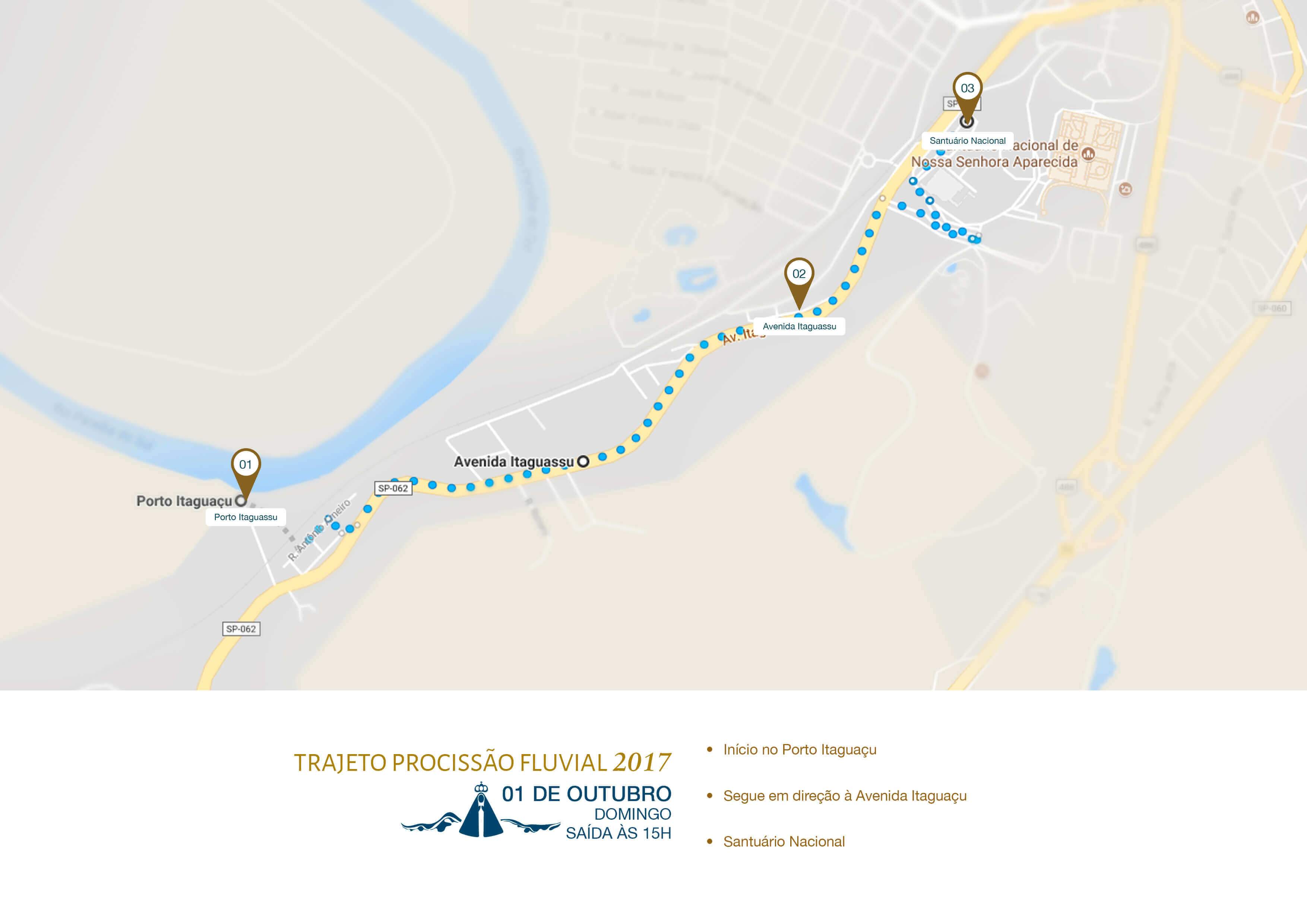Às 14h acontece a Procissão Fluvial, saindo da cidade de Pindamonhangaba e percorrendo o rio Paraíba até chegar à Aparecida. Às 16h, os devotos são convidados a seguirem em procissão do Porto Itaguaçu ao Santuário de Aparecida.