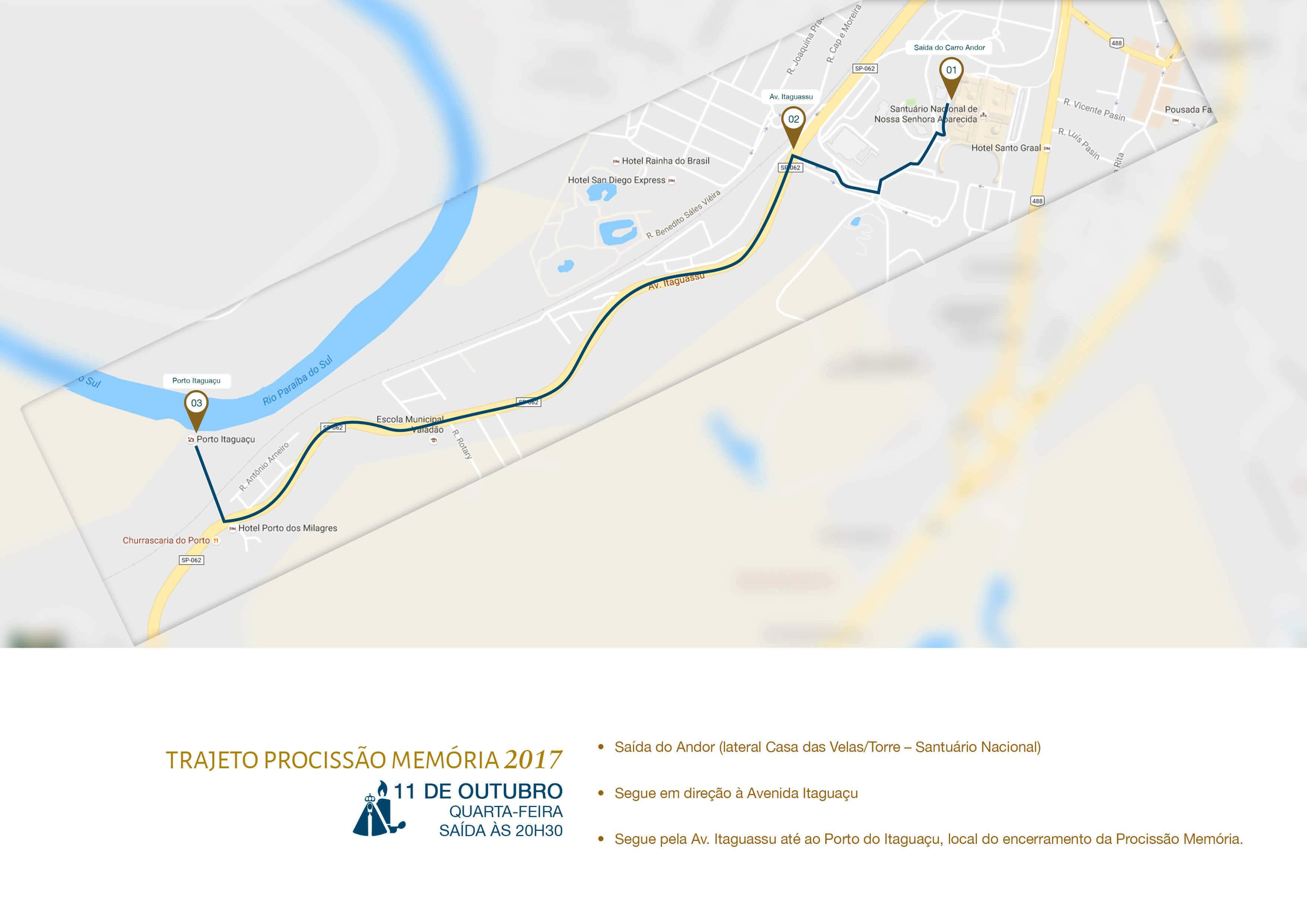 No dia 11 acontece a tradicional Procissão Memória, saindo do Santuário, ao lado da Torre Brasília e seguindo para o Porto Itaguaçu, com muitas velas iluminando o trajeto os devotos recordarão o encontro da imagem de Aparecida há 300 anos. A procissão saíra às 20h30.