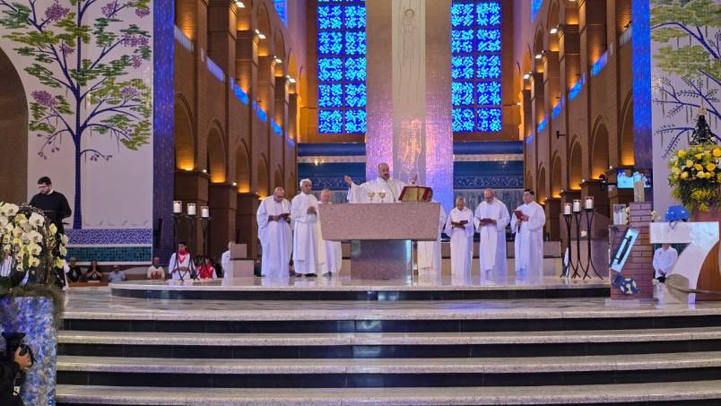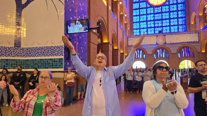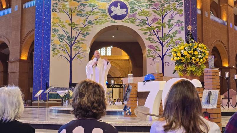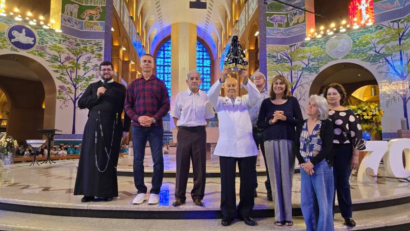 Ao final da Missa, diante da imagem de Nossa Senhora Aparecida, os devotos renovaram a consagração à Mãe da Esperança, agradecendo pelas sete décadas de fé e pedindo forças para seguir cuidando da casa que acolhe o Brasil inteiro.