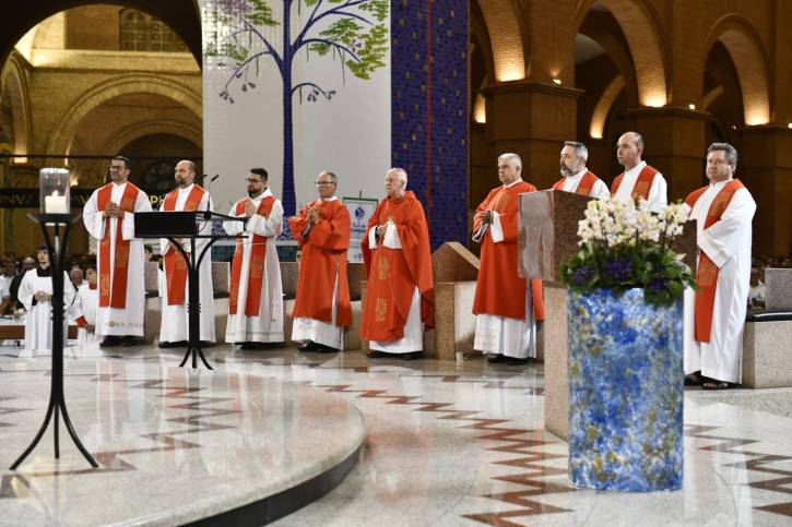 A Eucaristia foi presidida por Dom Gil Antônio Moreira, administrador apostólico da Arquidiocese de Juiz de Fora (MG) e bispo referencial do movimento junto à CNBB. A celebração contou ainda com a condução do diretor de arte e programação da TV Aparecida, Irmão Alan Patrick Zucheratto, C.Ss.R., e a presença do reitor do Santuário, Pe. Eduardo Catalfo, C.Ss.R., dos administradores-ecônomos Pe. Fábio Evaristo, C.Ss.R. e Adam Rapala, C.Ss.R., além de diversos missionários redentoristas e diretores espirituais dos grupos do Terço dos Homens que se fizeram presentes neste primeiro dia de romaria.