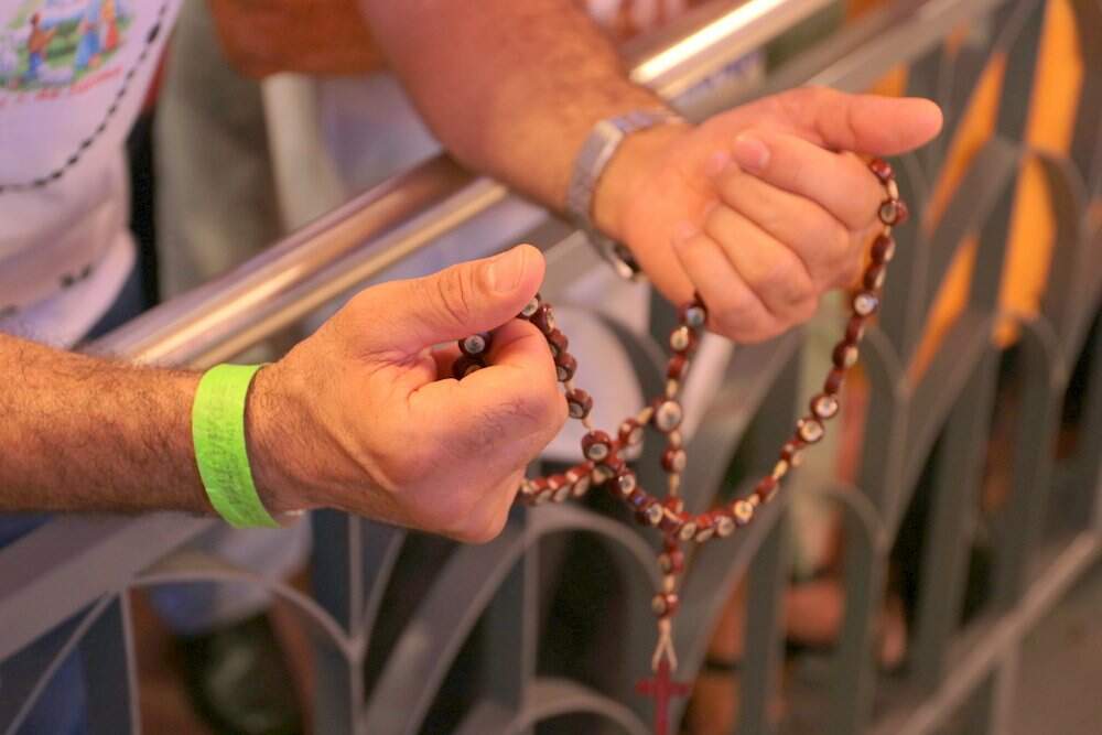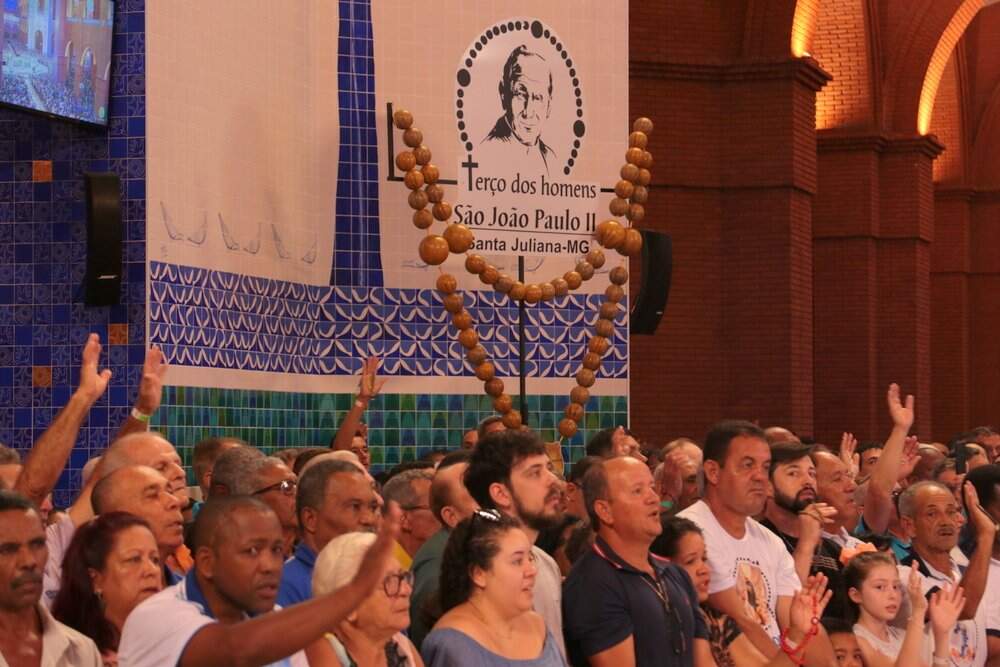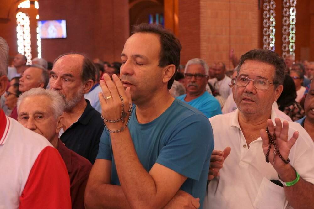Um dos principais momentos da Romaria Nacional do Terço dos Homens é a Oração Solene do Santo Terço no Altar Central, às 13h45.