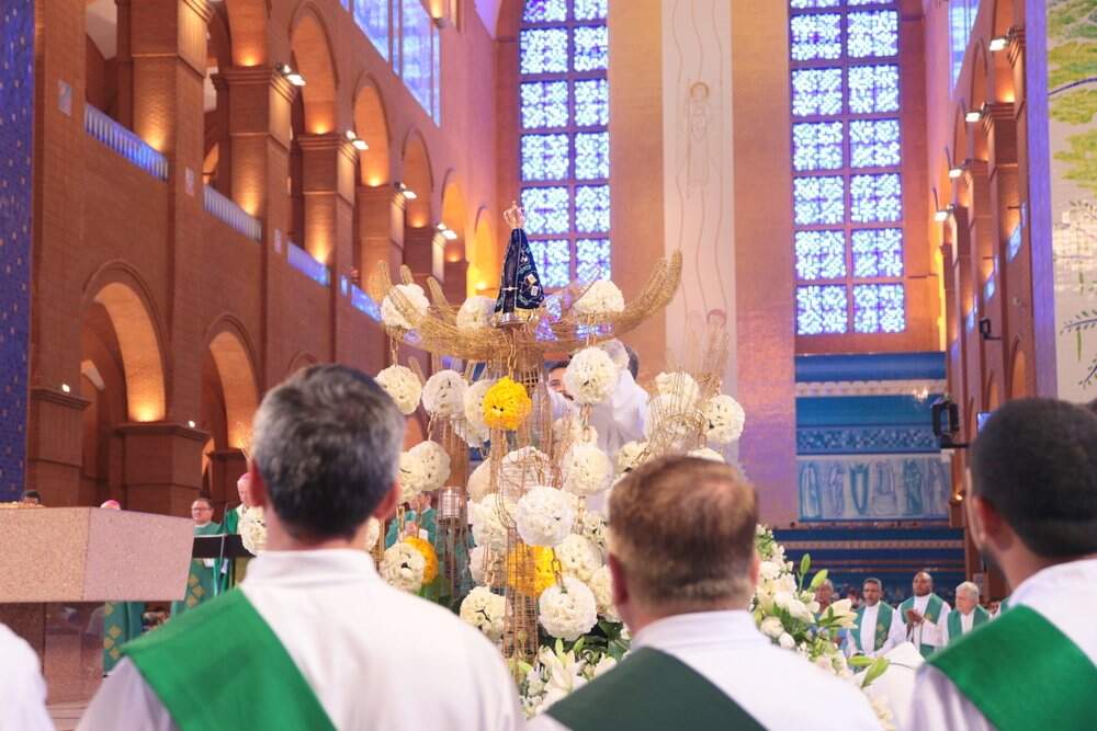 No interior da Basílica de Aparecida, os milhares de homens do terço apresentaram as suas intenções e rezaram o mistério luminoso, aos pés da Padroeira do Brasil.