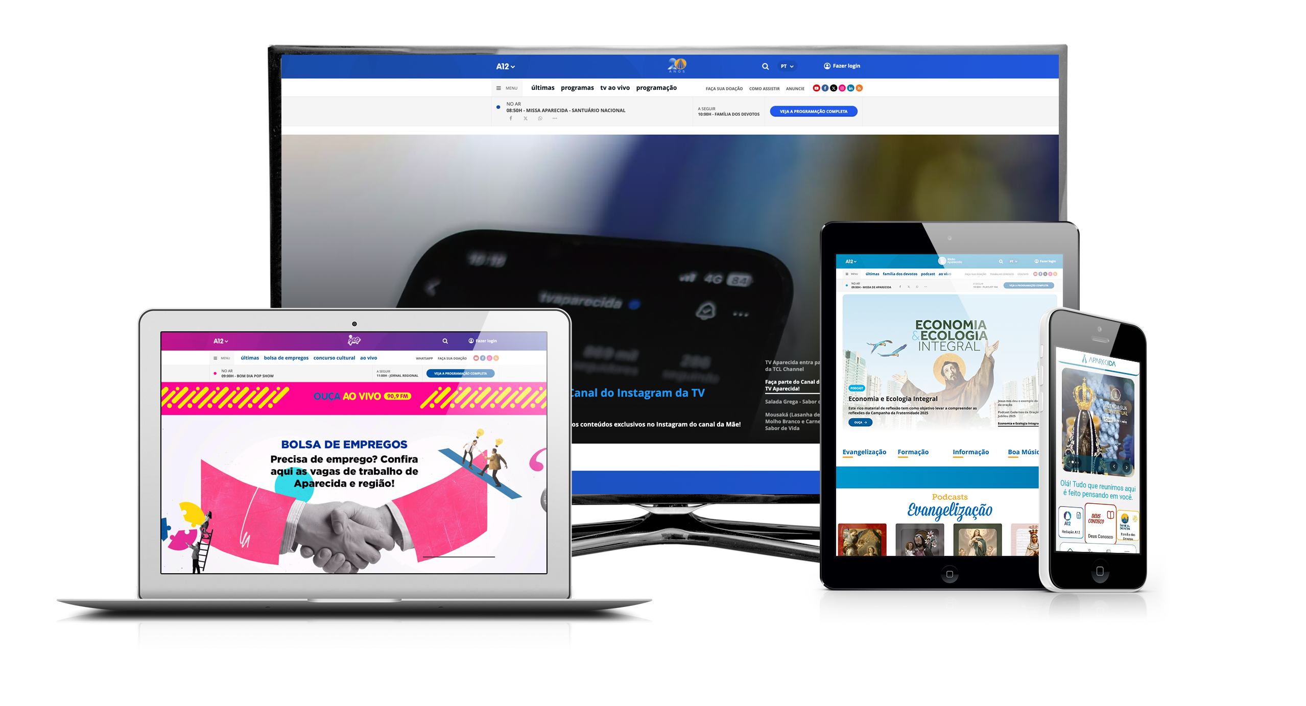 Informações sobre como anunciar nos veículos: Portal A12.com, Aplicativo Aparecida, Santuário Nacional ao Vivo, TV Aparecida e Rádio Aparecida.