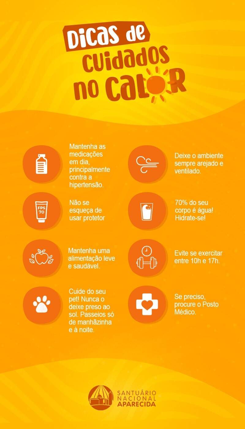 O Brasil está passando por uma intensa onda de calor, com temperaturas superiores à média esperada para esta época do ano em todas as regiões. Por isso, o romeiro que visita o Santuário Nacional precisa se atentar e colocar sua saúde e bem-estar como prioridades. Só assim será possível aproveitar os passeios e as emoções de estar junto à Mãe Aparecida.