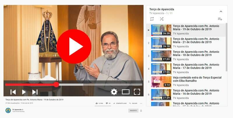 Acompanhe o Padre Antonio Maria no Terço de Aparecida quando e onde quiser! A Tv Aparecida no YouTube tem uma lista especial com os terços diariamente. De segunda a domingo, você pode assistir na TV Aparecida, no A12 ou no YouTube, quando quiser.