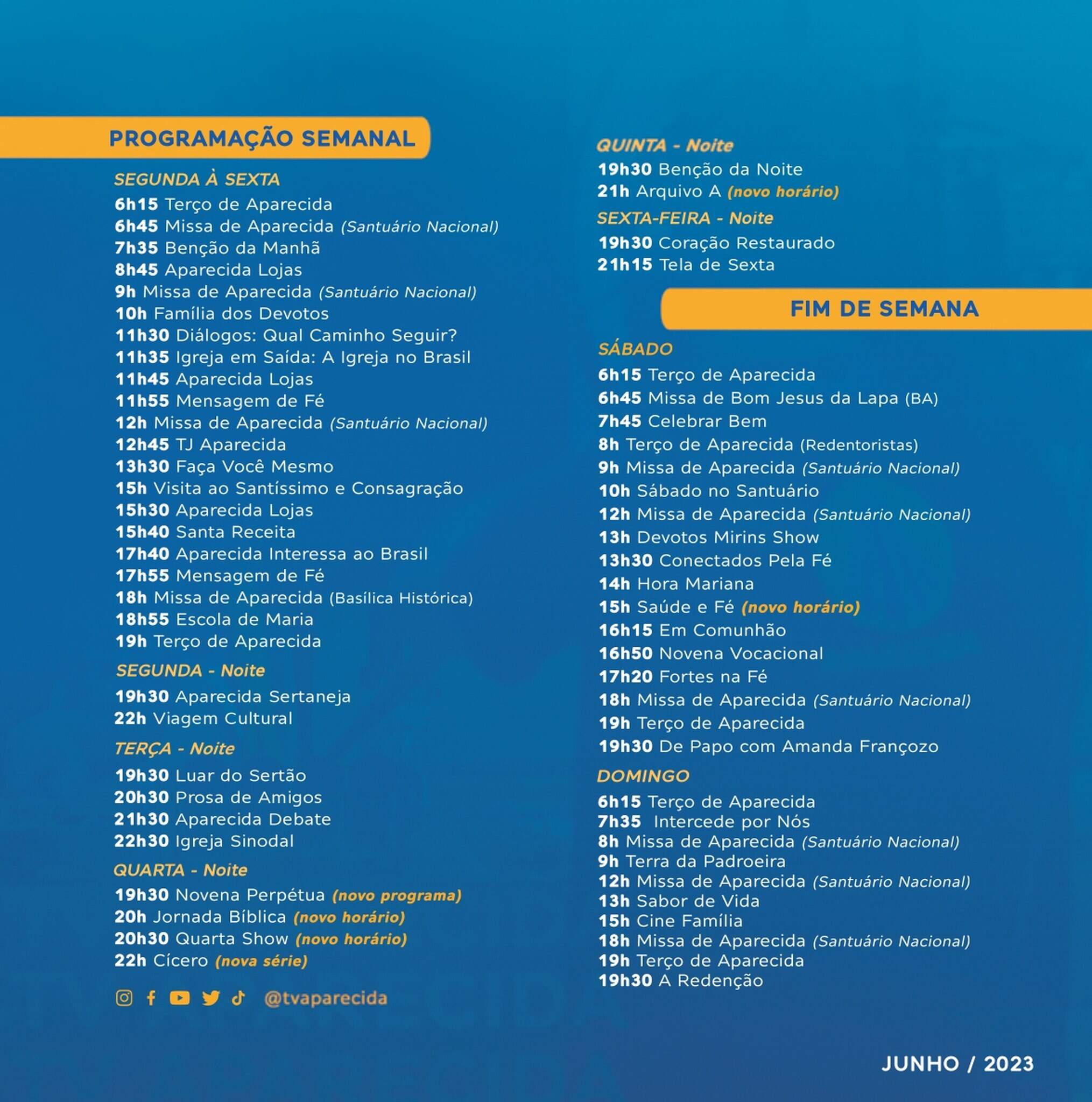 A programação da TV Aparecida também está com novos horários. Por conta da estreia de "Novena Perpétua", nas quartas dois programas estão meia hora mais tarde: o "Jornada Bíblica" é às 20h, e o "Quarta Show" foi para às 20h30. E na quinta-feira, o "Arquivo A" agora é exibido às 21h.