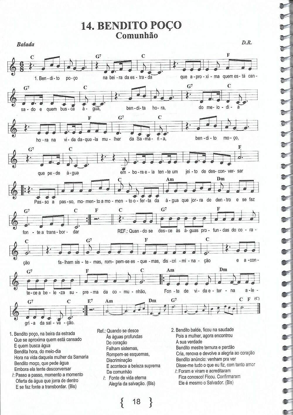 E os cantos apresentados nesta semana por Irmã Custódia e Juliana Gianetti, cantora e organista do Santuário Nacional, são: “Bendito Poço” – D.R. e “Mestre, Onde Moras?” – Gustavo Balbino / Osmar Coppi. Eles nos ajudam a rezar por meio das belas mensagens que passam. Veja as partituras:
