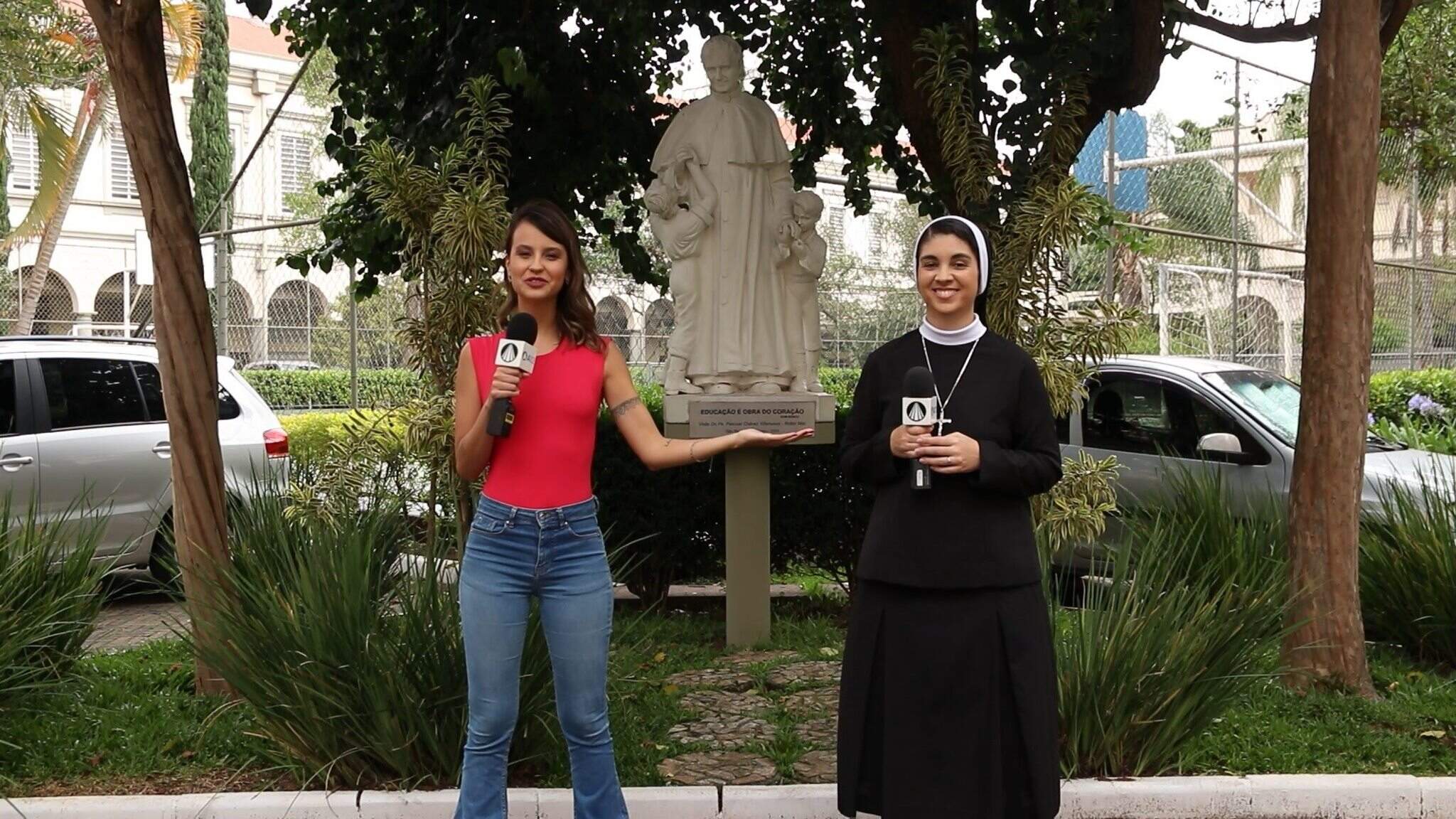 Letícia Andrade e Irmã Grazielle Rigotti vão passear pelos corredores da instituição para conhecer um pouco da história do lugar e também sobre quem foi Dom Bosco, fundador da Congregação Salesiana.