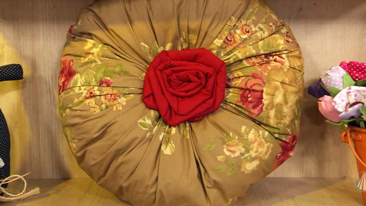 3 - Encher a almofada com a fibra e fechar como fuxico arrematar e atravessar a almofada e prender com a flor de acrílico; e
