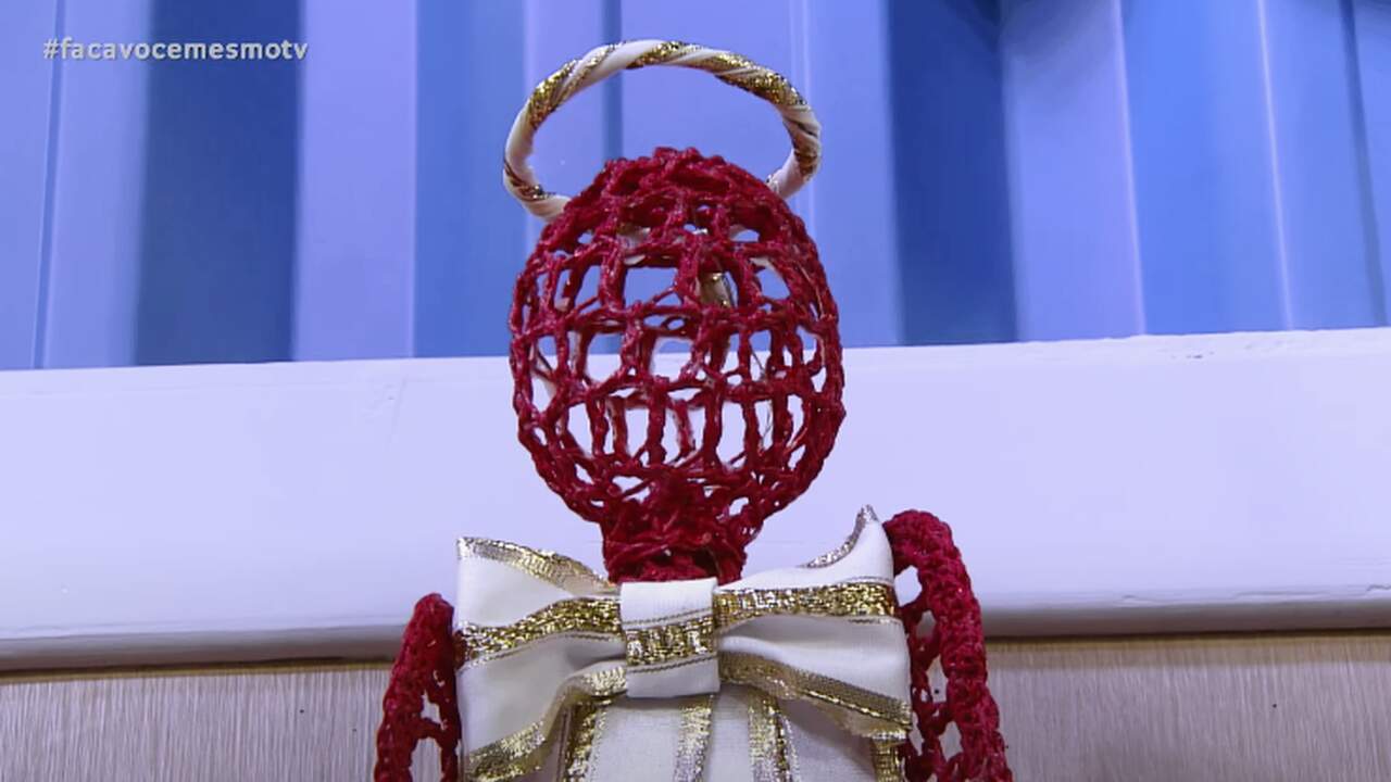 Decorar e colar fitas natalinas, fazendo uma auréola e um laço, e adicionar as luzes internamente no anjo;