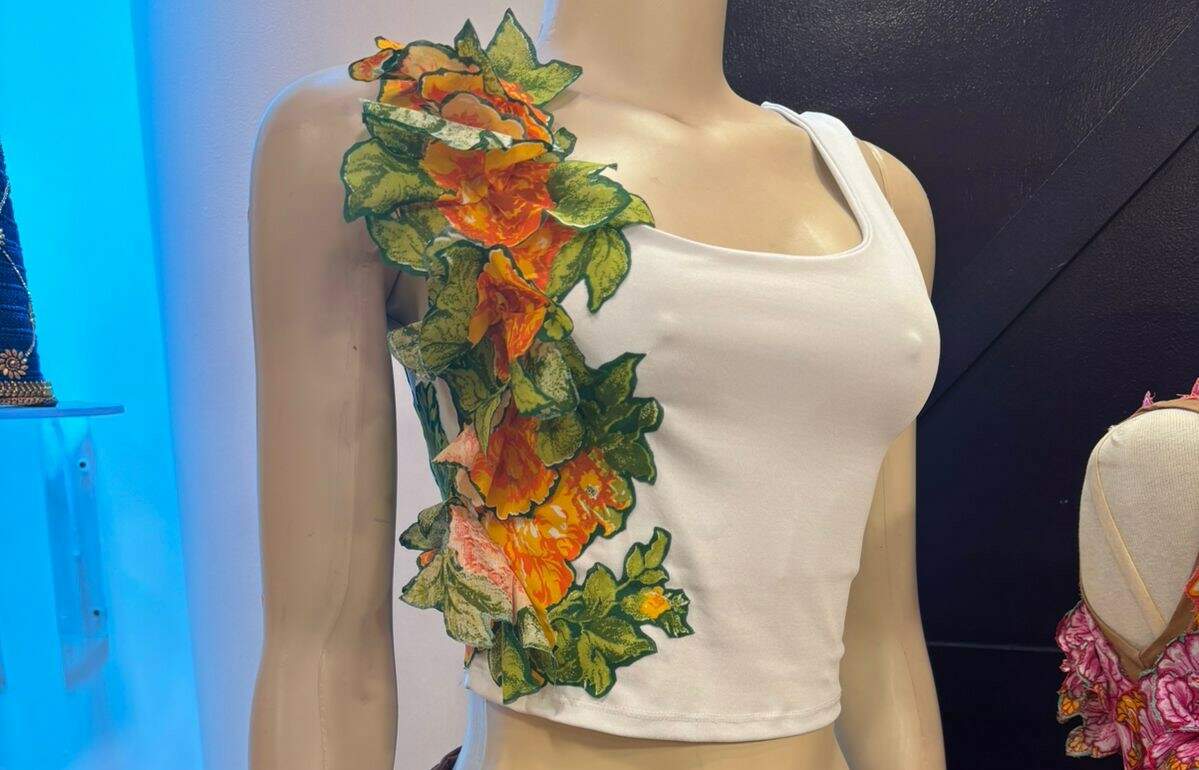 5. Colar por cima das flores base, já aplicadas, as flores costuradas 3D