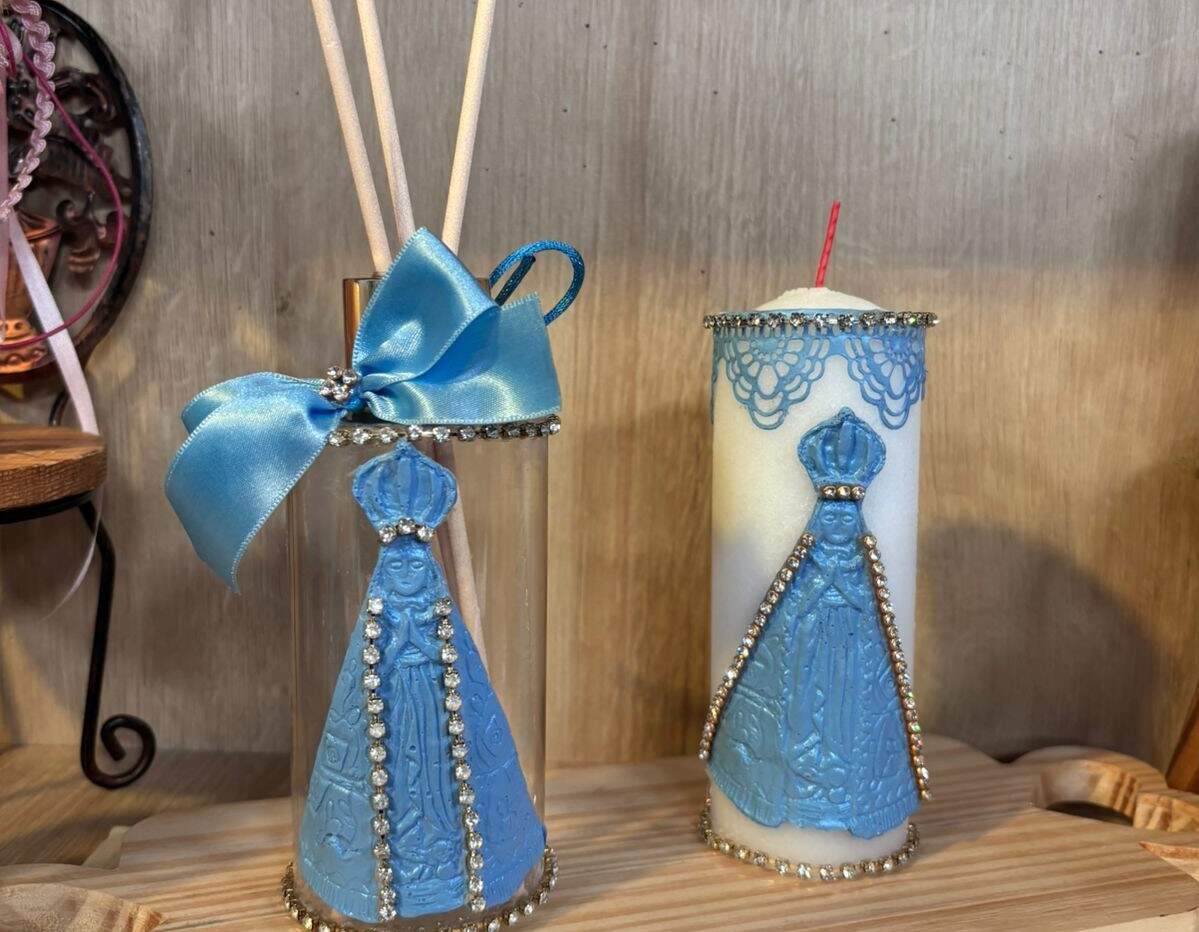 Colocar no molde de silicone de Nossa Senhora, a tinta renda azul. Aguardar secagem por 4 horas. Retirar e colar ela no frasco do aromatizador. Na tolha de lavabo, colocar o stencil e pintar com a ajuda do pincel de tecido usando a tinta para tecido azul.