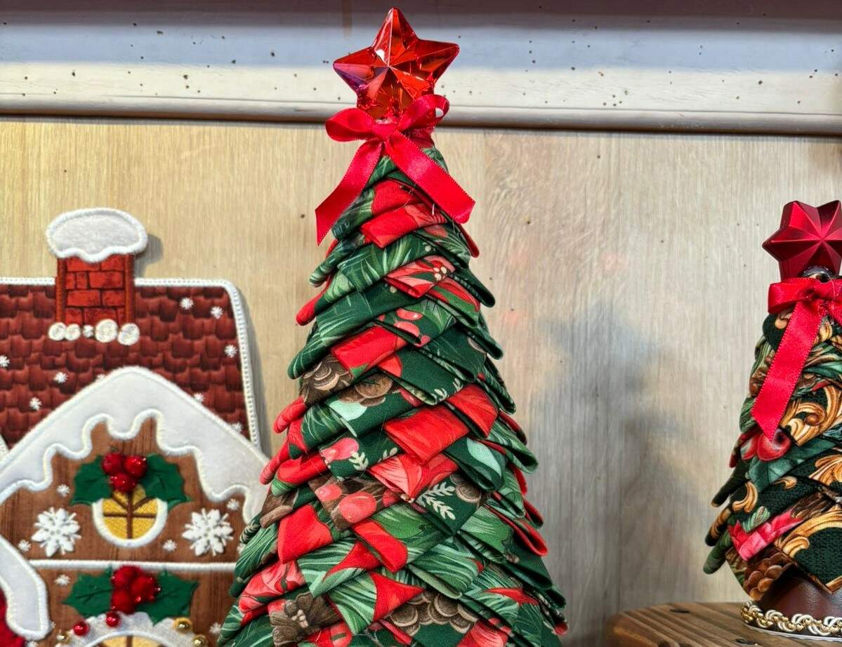 Cortar o tecido de Natal em quadrados de 6x6cm. A quantidade de quadrados varia de acordo com o tamanho da árvore de isopor.