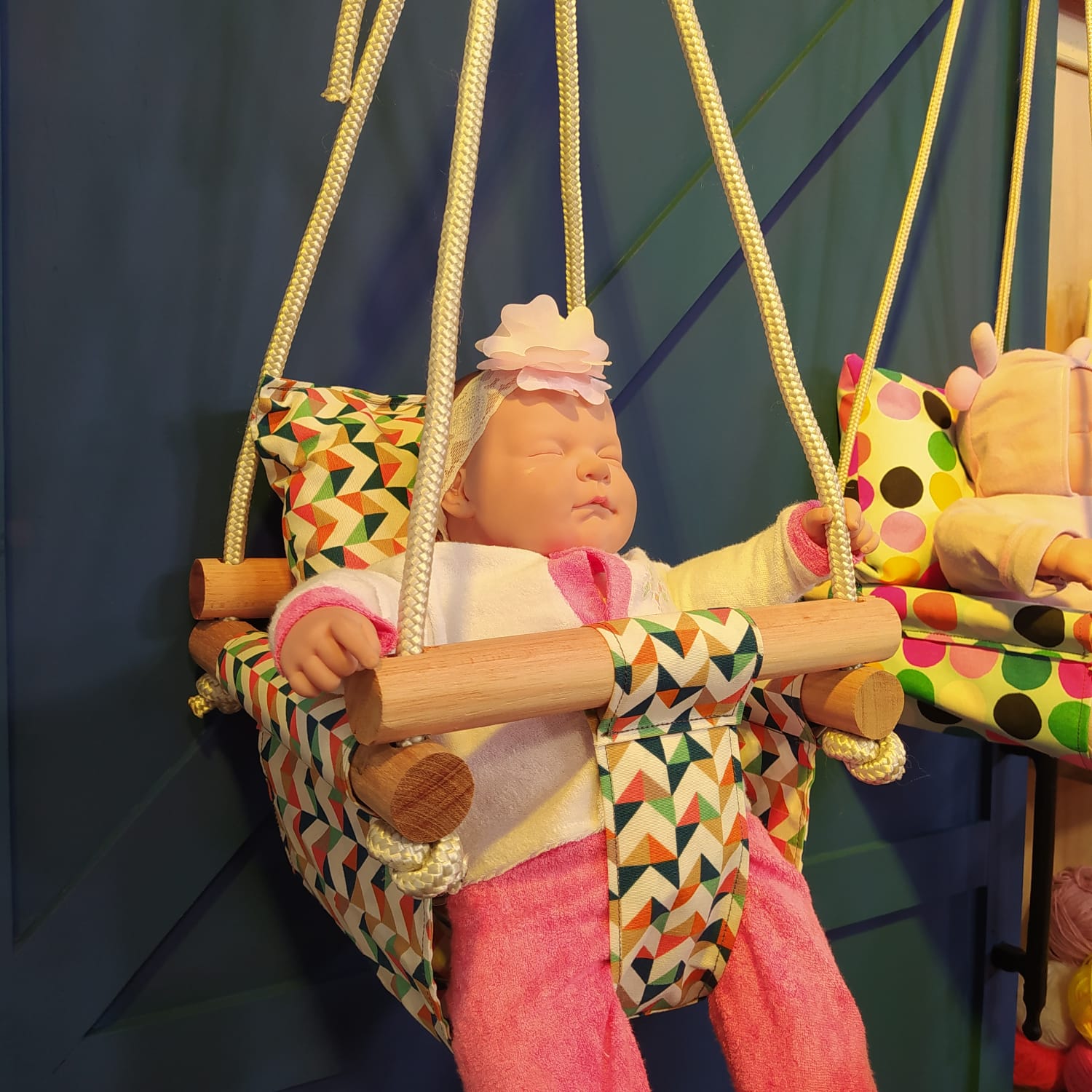 Faça a borda de costura nas peças. Depois, corte a madeira em 4 bastões de 30 cm e fure para a espessura da sua corda, a 2 cm da borda dos bastões. Lixe as peças e, se quiser, dê acabamento com verniz. Monte o balanço com bastões e cordas passando pelo tecido.