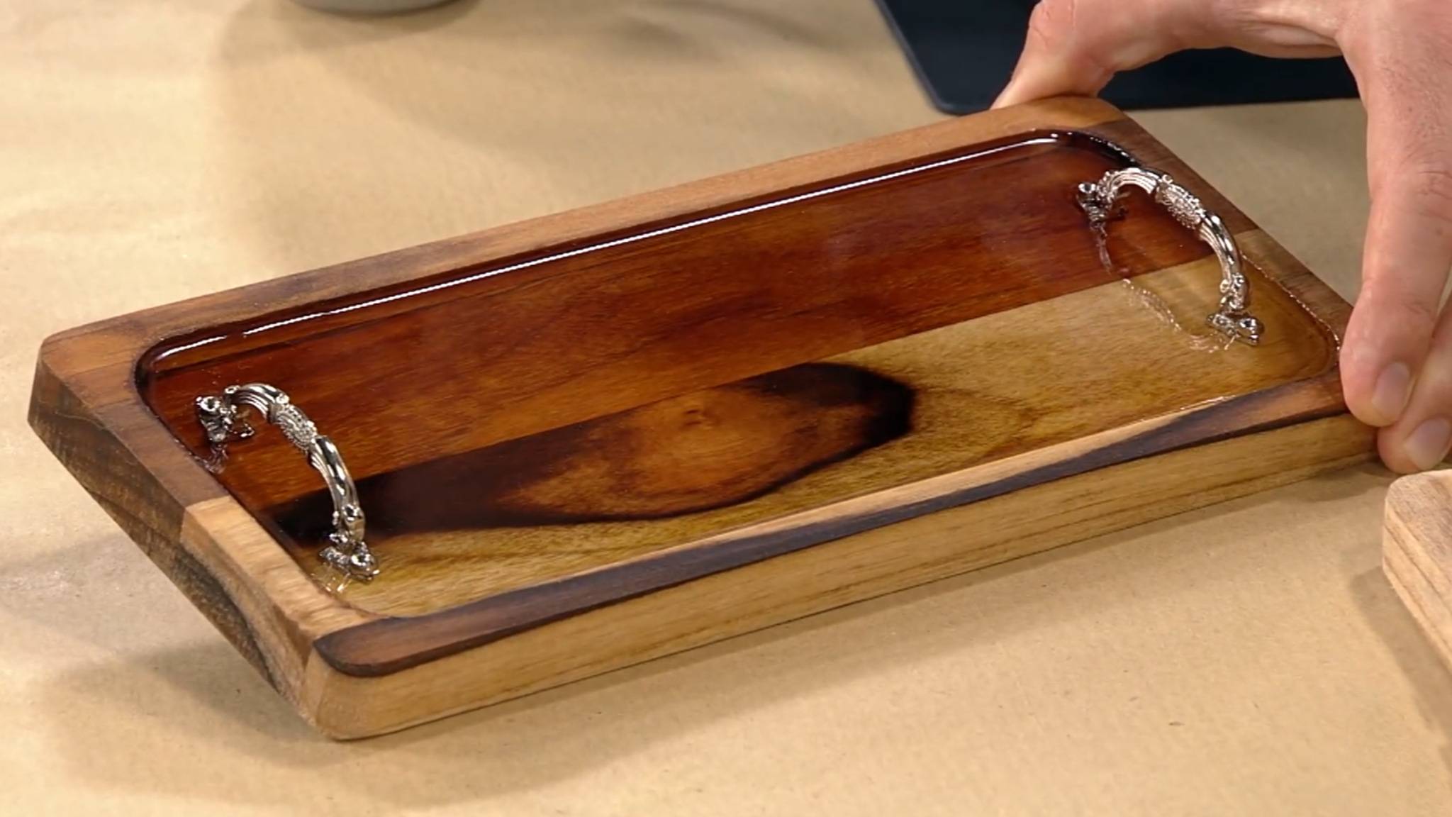 Em seguida, posicione as alças no local desejado e despeje a mistura da resina epóxi sobre todo o fundo da bandeja. (As bolhas que surgirem fazem parte do processo e podem ser facilmente eliminadas com algumas borrifadas do Spray Quebra-Bolha Epóxi Redelease).