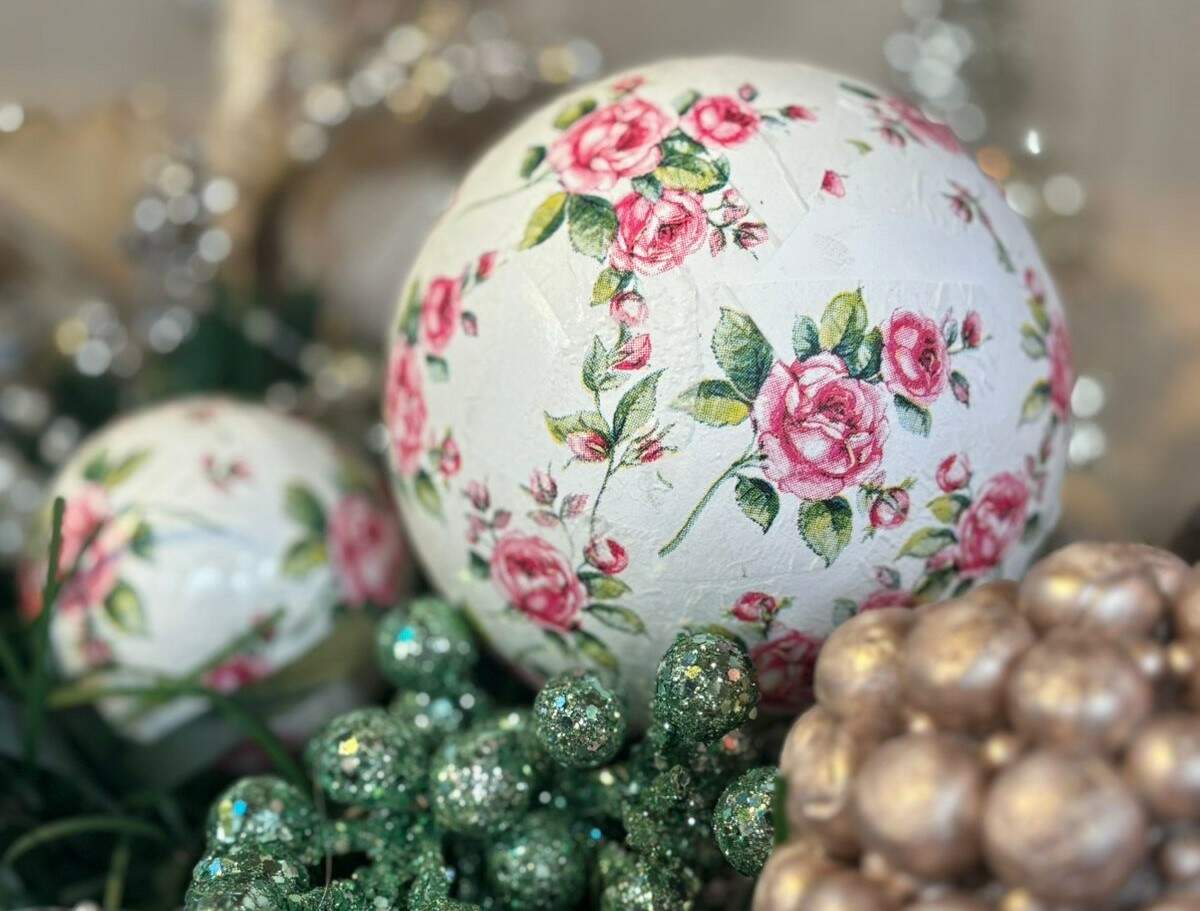 Pinte a bola de Natal com a tinta spray e após a secagem, faça a Decoupagem com o guardanapo.