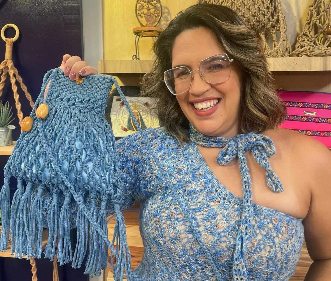 8. Nossa bolsa está pronta! Agora é só fazer uma trança com 4 fios com os fios da alça, uni-la com uma costura e fazer o acabamento com os mesmos nós quadrados com o fio de 1,50m.