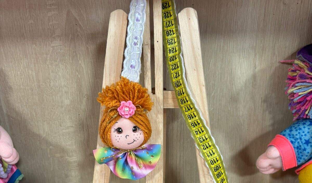 Faça o molde de um círculo com 10 cm de diâmetro, com a agulha e linha faça um fuxico, encha com a fibra siliconada feche o fuxico, faça as marcações dos olhos, cole os olhinhos resinados, desenhe a boca e o nariz, com a lã envolva os 4 dedos fazendo 10 voltas corte e amarre na parte de cima, faça isso 2 vezes, cole na parte superior da cabeça, amarre nas laterais fazendo duas xuxinhas, cole as flores, na fita métrica costure a fita gorgorão ou o entremeio em toda fita métrica deixando um pedaço no começo e no final , cole a cabeça na parte final da fita e o broche na parte de traz, com a fita gorgorão de 9mm corte 12 cm e alinhave fazendo uma saia franzida, cole na pescoço da boneca. E está pronta