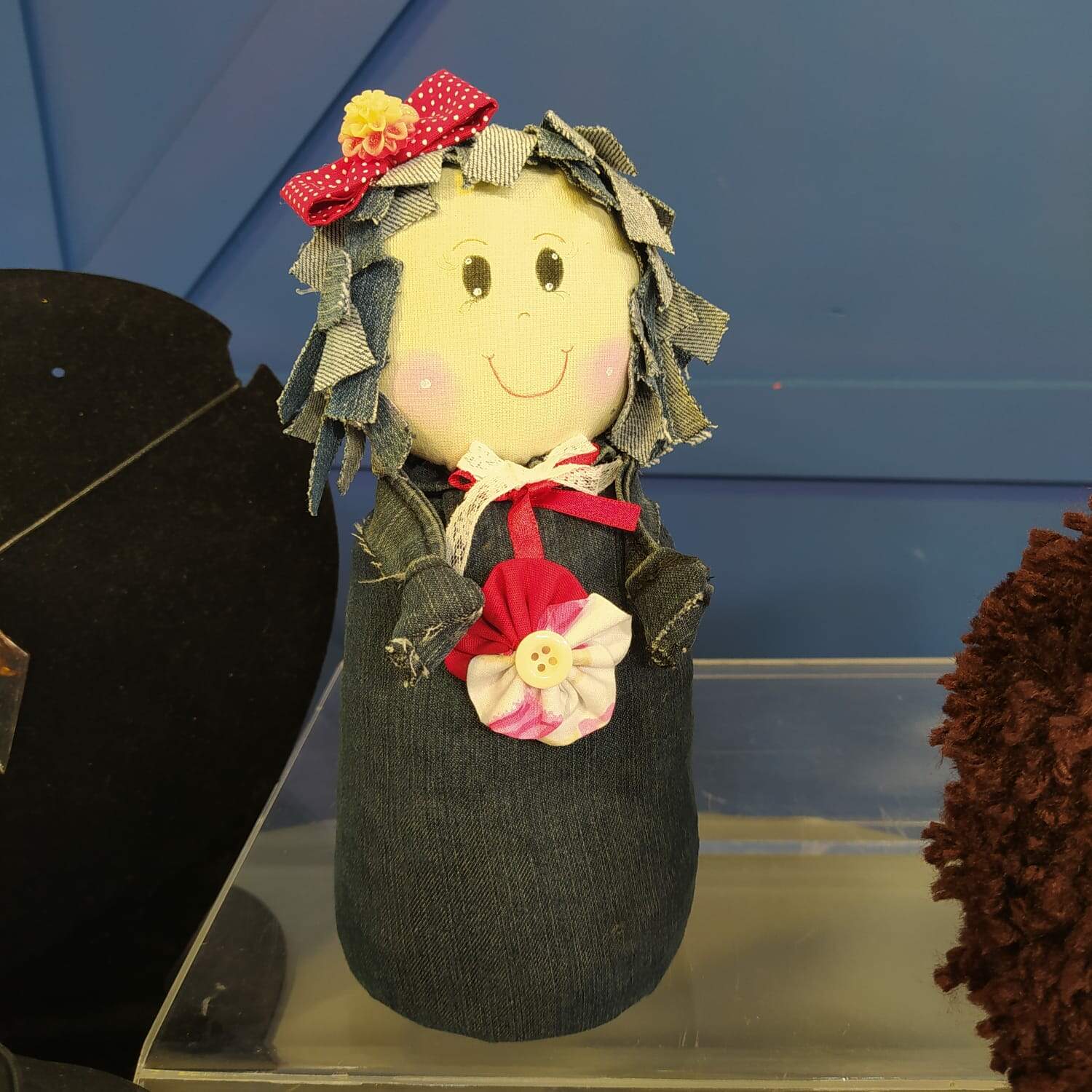 Para fazer o braço, cortar uma tira de 40 cm, amarrar as pontas e colar na boneca