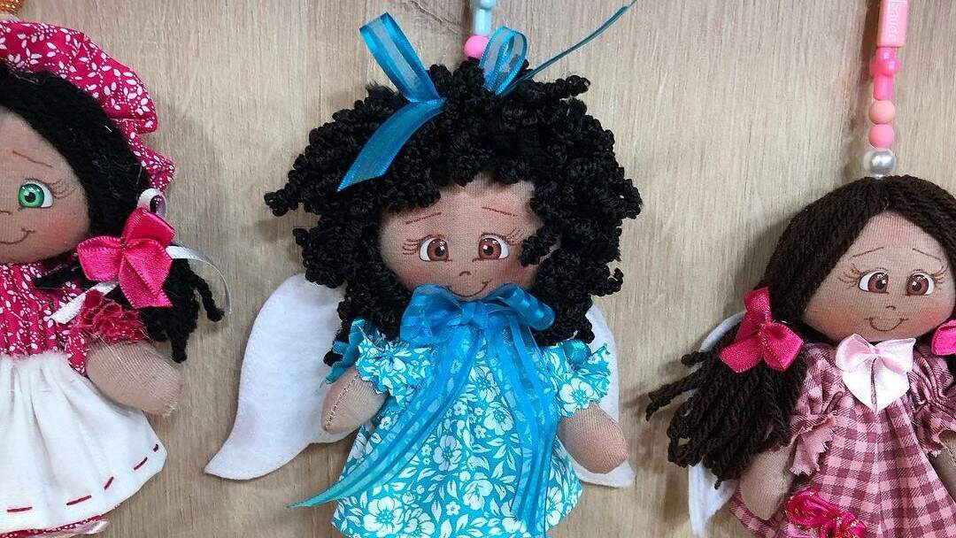 Pegue o cordão encaixe às contas de sua preferência e amarre a uma das extremidades do mosquetão, em seguida com o auxílio de uma agulha e linha prende a outra extremidade do cordão na cabecinha da bonequinha.