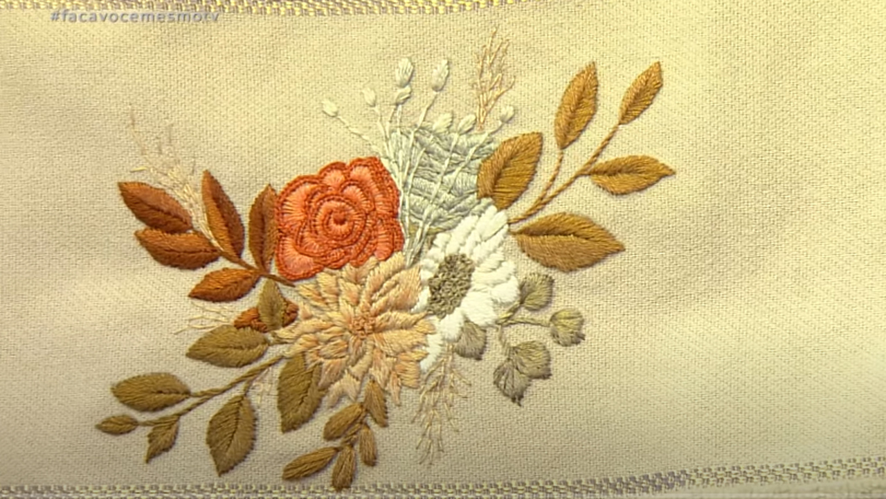 Ponto folha: com a linha na ponta, faça um ponto reto, a partir do centro e já coloque pra um lado, pode ser o esquerdo, volte para o centro, descendo sempre um pouquinho e vá com sua agulha para o lado direito, sempre descendo de todos os lados um pouquinho.