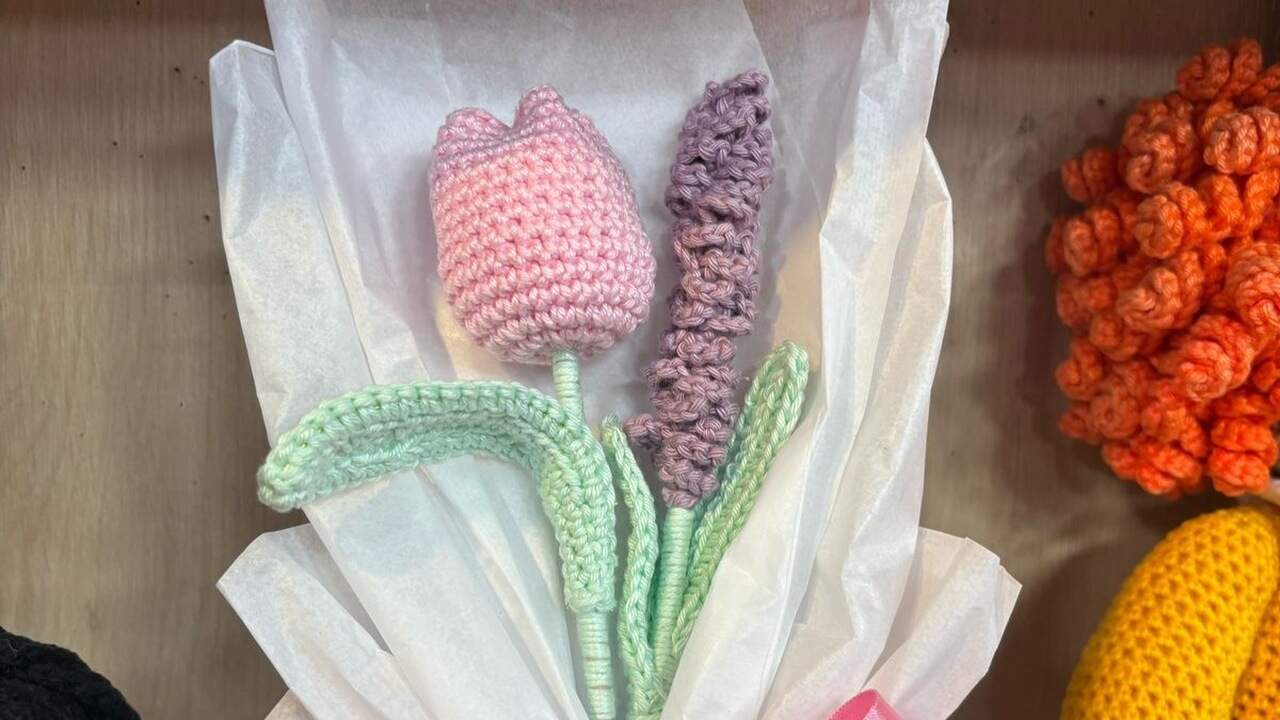 1 - Encapar o palito de churrasco: metade com fio lilás e metade com fio verde;