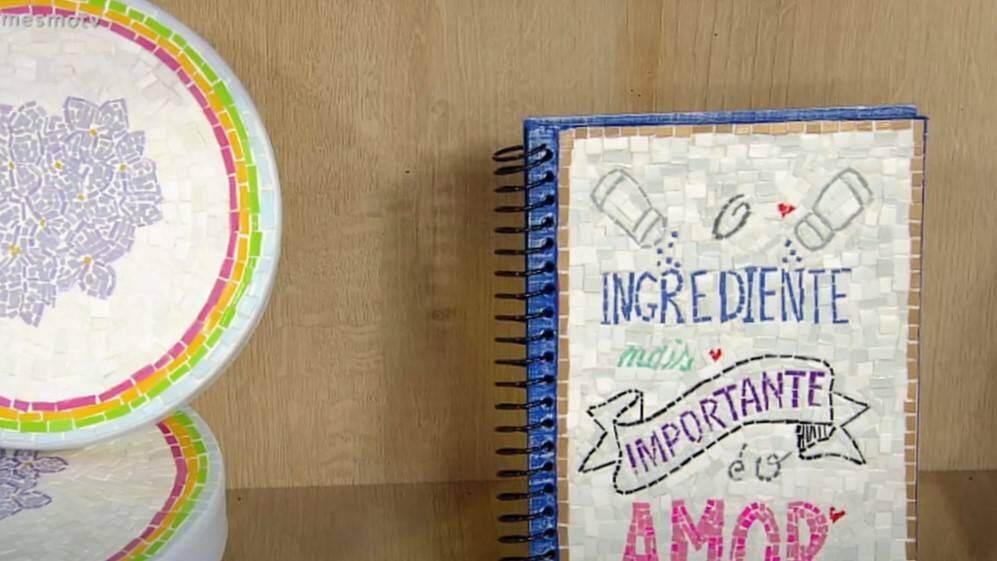 10 - Com a esponja marinha levemente umedecida com látex branco passe no caderno onde não tem o mosaico. Depois de tudo seco monte o caderno novamente e está pronto.