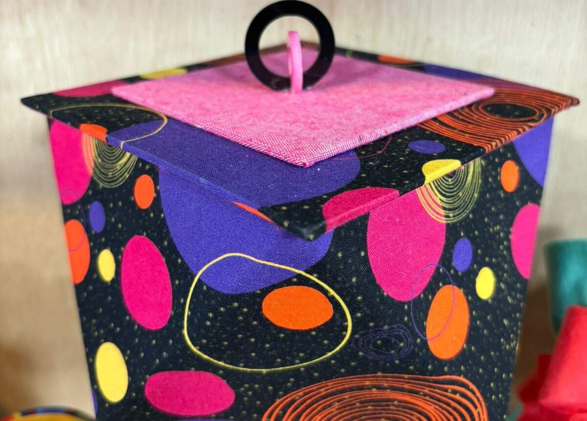 5 - Para a tampa: revestir com tecido, fazer fio de cabelo nos 4 cantos, virar a sobra do tecido, para um bom acabamento nas bordas