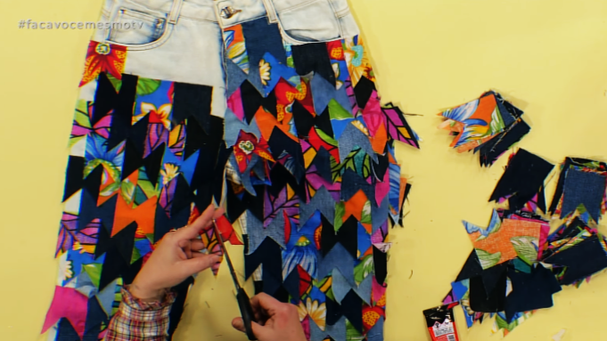 2. Utilize o molde para marcar o formato das bandeirinhas nos retalhos de jeans e chita;