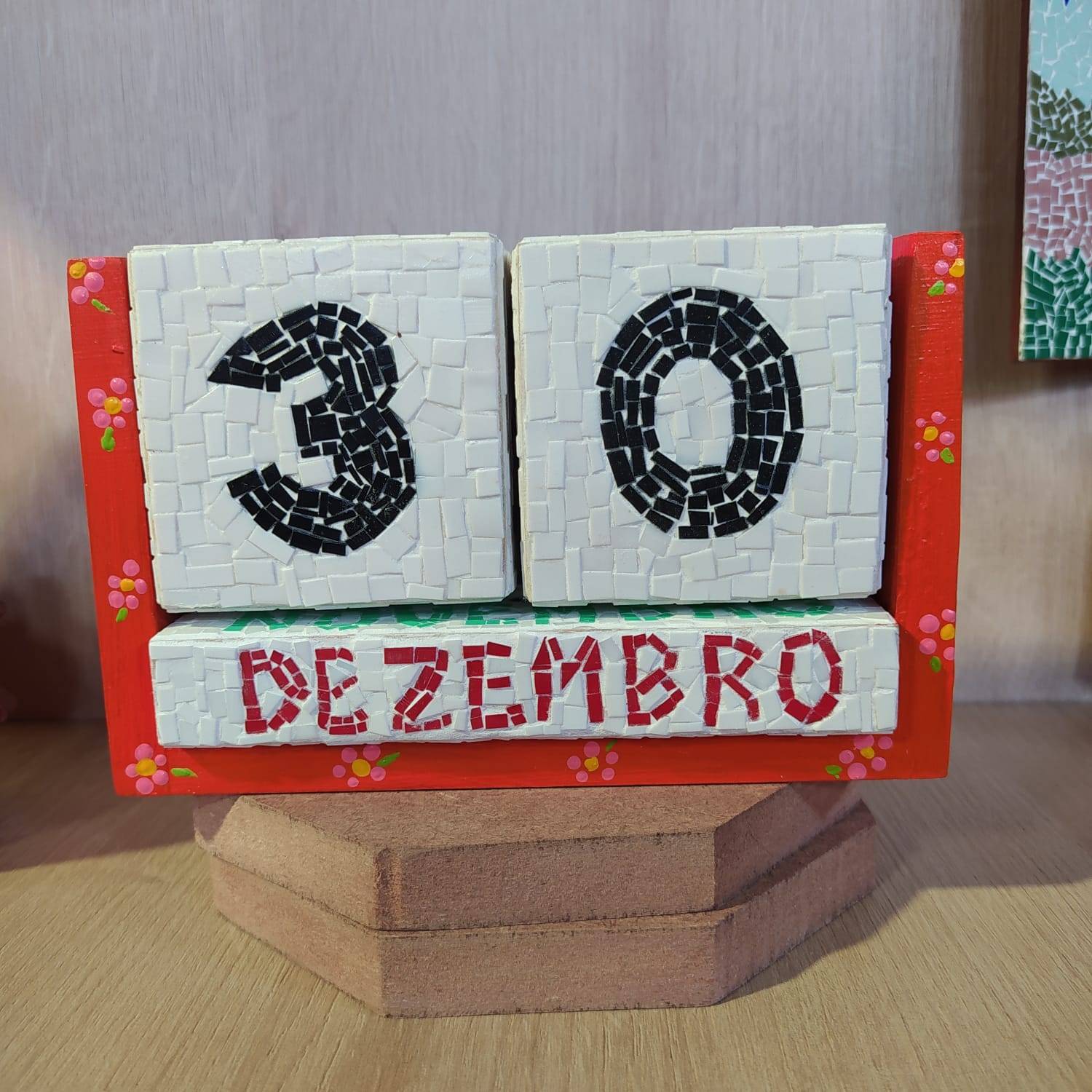 Passe látex branco em toda peça, deixe secar e lixe com o lixa fina. Com ajuda do carbono passe o risco dos números e letras na peça, reserve. Corte os plásticos em pequenos pedaços e comece a colar no risco respeitando a marca, deixe sempre espaço entre elas , preencha toda peça e depois o fundo das letras e números com plástico branco. Deixe secar por 24h. E só aí faça uma pastinha de rejunte branco passe por cima de todo mosaico. Com a ponta dos dedos, tire o excesso e limpe com um pano levemente úmido, deixe secar e passe o verniz a base de água. Depois com a cor desejada pinte a base do calendário e envernize. Pronto está finalizada sua peça.