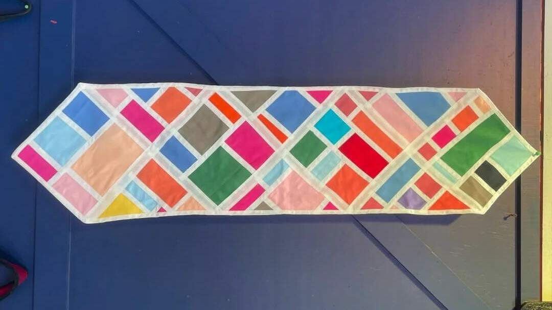 Então uniremos com o viés de 3,5 cm assim: 1 quadrado no início e 1 triângulo. Os dois quadrados da ponta vão ficar dessa forma e os outros 2 os dois internos unir 2 triângulos. Ficou pronto nosso caminho, agora é só forrar com um lindo tecido e dar o acabamento com viés de 3,5cm