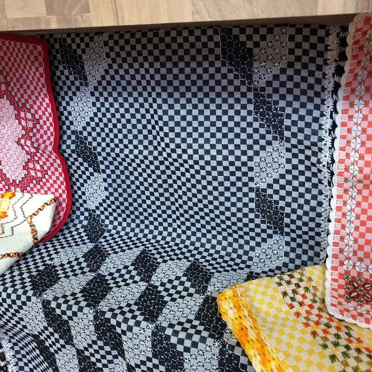 Deixe 0,5 cm ao redor para margem de costura no tecido xadrez e borde com ponto cruz duplo na diagonal, use uma cor de linha de contrastante no tecido.