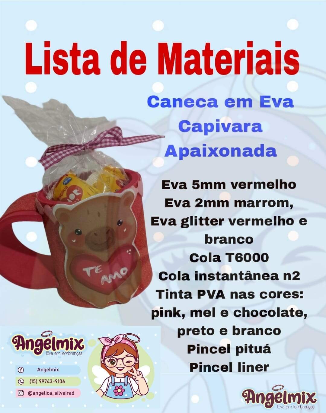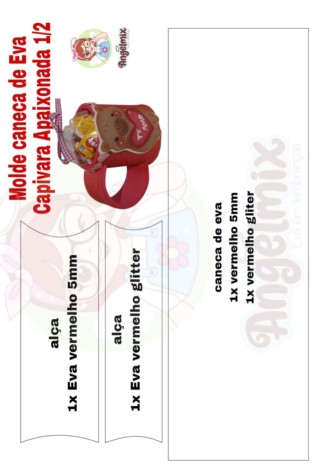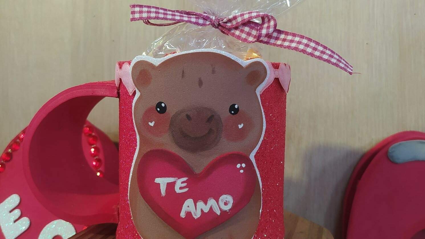 Para fazer o aplique da capivara, basta sombrear o molde, fazer a pintura do rostinho, encaixar o coração e colar Eva branco glitter no fundo.