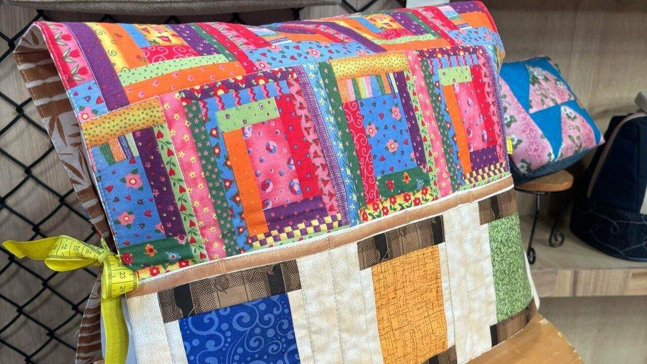 13 - Posicione o bolso em uma das extremidades do tecido principal e faça uma costura entre os blocos de patchwork, dividindo o bolso em três partes;