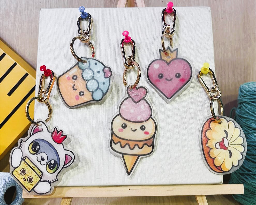 Recorte as sobras de cola quente. Faça um buraquinho com o furador na para passar a argola para chaveiro ou o mosquetão;