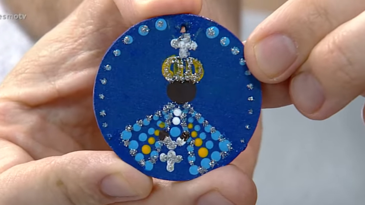 6 - Com a tinta branca também traçamos em pontos o terço e a Cruz entre o Manto;