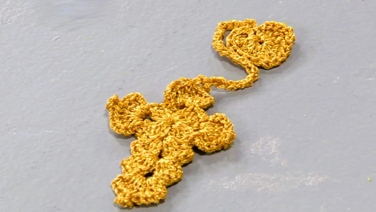 3 - Repetição: Repita essa sequência (4 pontos altos, 3 correntes, 4 pontos altos) por mais 3 vezes, totalizando 4 lados, para formar a base do crucifixo;