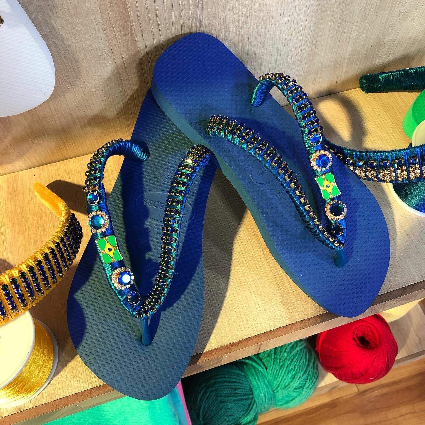 Retire a correia do chinelo, empurrando a base com o alicate de bico chato. Dê três nós com o fio de seda de 1 mm e comece a enrolar na medida de mais ou menos uns dois dedos. Meça até o final de um lado da correia e corte na medida 3 carreiras dos strass, 2 do azul e 1 do verde tamanho ss12. Posicione os três strass para começar a aplicação com a técnica passagem do fio no strass, enrolando duas vezes em cada espaço dos strass até o final da primeira correia.