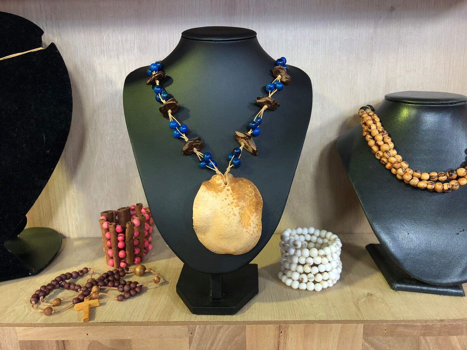 6) Ao colocar o último conjunto de açaí, dê o espaço de 4 dedos e onde tem o nó da alça. Faça um nó e coloque a semente de açaí nos 3 cordões juntos. Leve o açaí até o nó e dê outro nó prendendo o açaí. Corte o excesso de cordão e queime levemente na chama azul do fogão. Pronto. Depois é só colocar o botão que fecha seu colar.