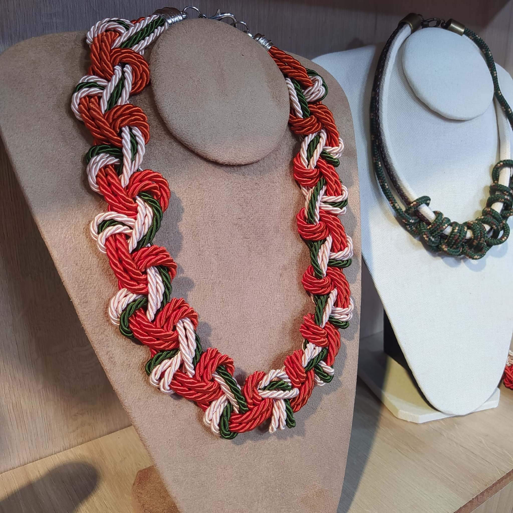 Cordão trançado nas cores laranja, vinho e rosê