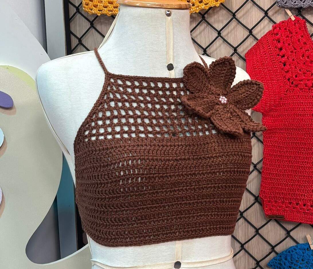 Inicia-se pela parte de cima. Fazer corr. Até alcançar a medida da metade da clavícula de ombro a ombro. No meu caso tamanho p, fiz 18cm de correntes. Ao final acrescentar mais 5 corr. , virar e fazer 1 p.a. na sexta corr. , 1 corr., e 1 p.a. no próximo, assim até o final da carr. (Ponto tela).