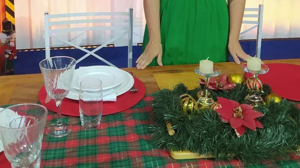 Para o arranjo central da mesa, utilizamos um festão, 2 taças (água ou vinho), bolinhas de natal, flores (opcional) e velas.