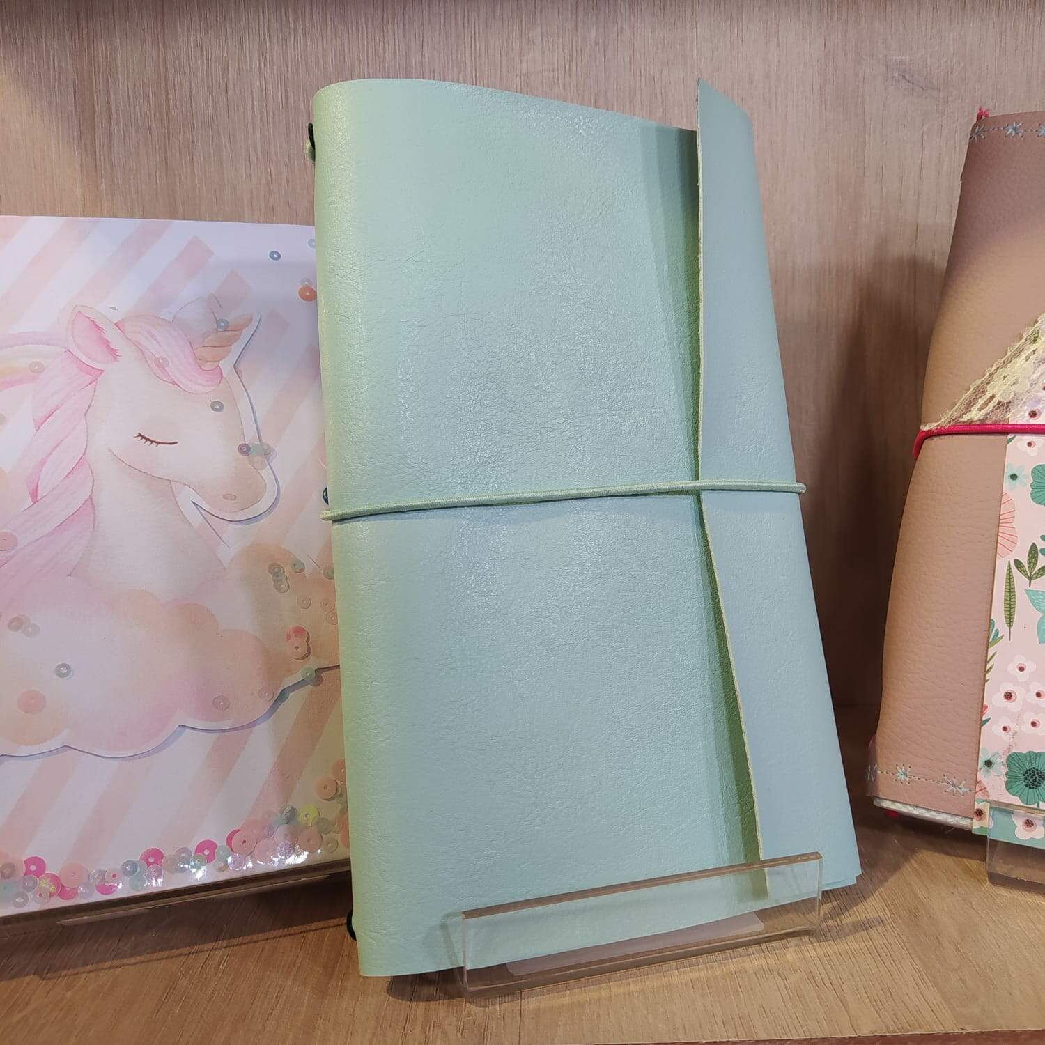 Passo 15 - Agora é só colocar os caderninhos tipo brochura do miolo encaixados em cada um dos elásticos pelo meio deles em cada elástico da parte interna da capa.